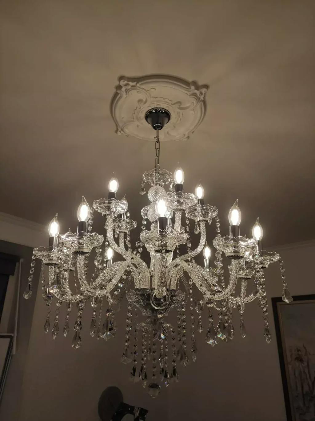 Keep your crystal chandelier looking brilliant with minimal effort. Dust the fixture regularly using a soft, dry cloth or a gentle brush to prevent dust buildup on the crystal elements. For deeper cleaning, use a microfiber cloth slightly dampened with a solution of equal parts white vinegar and distilled water, then dry immediately with a clean cloth. Avoid harsh chemical cleaners that can damage the polished chrome finish. Never spray liquid directly on the fixture; instead, apply the cleaning solution to your cloth first. When replacing bulbs, ensure the fixture is turned off and the bulbs have cooled completely. Use only E14 base bulbs rated for the voltage of your electrical system.